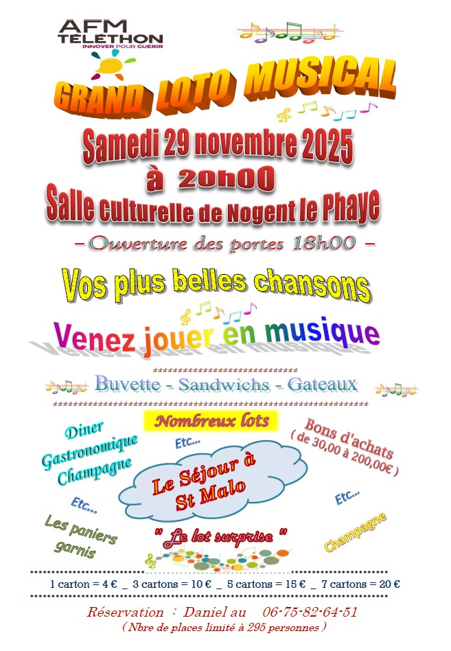 Le samedi 29 novembre 2025, la Salle l’Entracte de Nogent-le-Phaye vibrera au rythme de la musique et de la générosité lors du Grand Loto Musical organisé par l’AFM Téléthon.