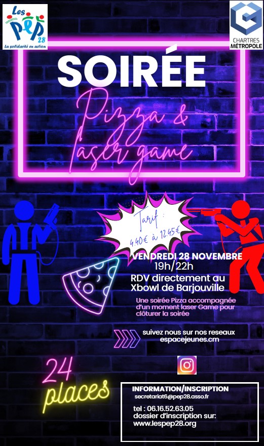 Vendredi 28 novembre, de 19h à 22h, rendez-vous directement au Xbowl de Barjouville pour partager un moment convivial autour d’une pizza, suivi d’une session Laser Game pour clôturer la soirée en beauté !